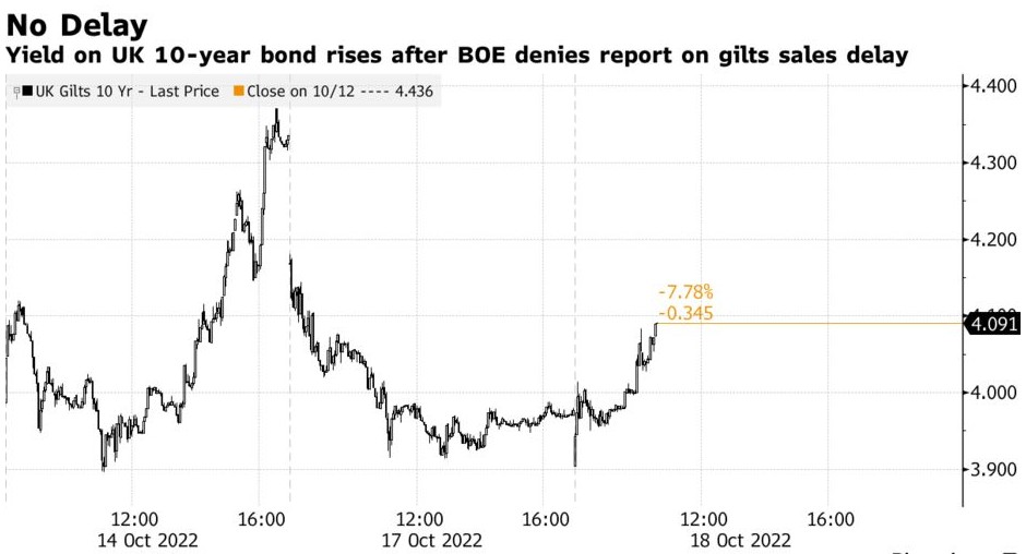 英国国债周二重挫,因英国央行否认将推迟出售金边债券的报道。消息公布后,10年期英国国债收益率飙升了11个基点,再次突破4%,而在周一,当政府取消了打击市场的财政计划后,国债收益率出现下滑。英国央行称,有关其将推迟发行债券的报道不准确。交易商担心央行和政府将大量发行主权债券。