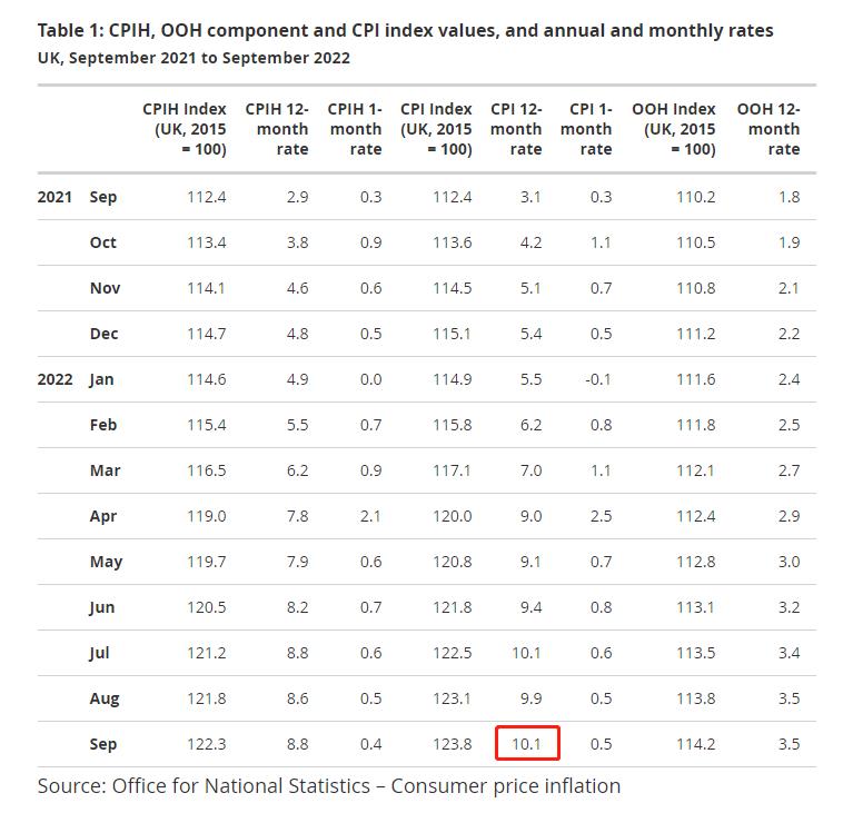 具体来看,数据显示,英国9月CPI同比上涨10.1%,重回40年高点。预期为10%,前值为9.9%,英国9月CPI环比上涨0.5%,预期为0.4%,前值为0.5%。