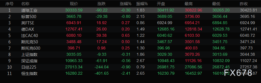 美股收盘情况: 道琼斯工业平均指数下跌0.3%,至30333.59点;标普500指数下跌0.80%,至3665.78点;纳斯达克指数下跌0.61%,至10614.84点。