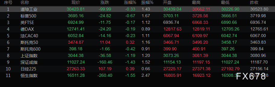 美股收盘情况: 道琼斯工业指数下跌0.33%,至30423.81点;标普500指数下跌0.67%,至3695.16点;纳斯达克指数下跌或0.85%,至10680.51。