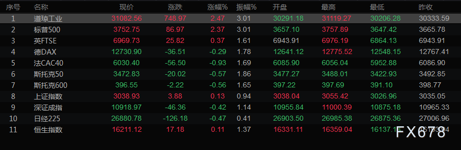 美股收盘情况:道琼斯工业指数上涨2.47%,至31082.56点;标普500指数上涨2.37%,至3752.75点;纳斯达克指数上涨2.31%,至10859.72点。