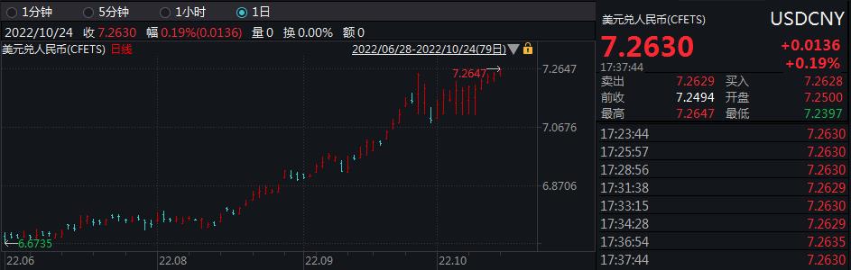 24日16:30,在岸人民币兑美元收报7.2610,较上一交易日跌116个基点。