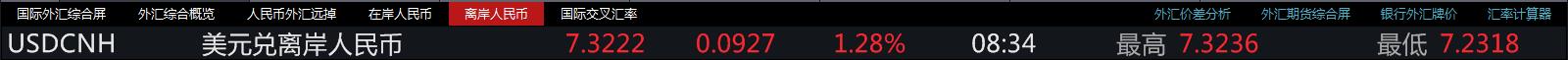 中新经纬10月24日电 24日17:19前后,离岸人民币兑美元跌破7.30关口,日内跌逾700个基点,随后小幅回升。截至发稿,离岸人民币兑美元报7.3222,日内跌超920个基点。