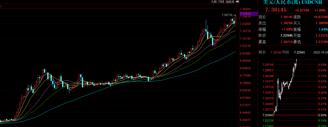 继9月中旬破“7”后,离岸人民币对美元汇率继续大跌。10月24日,离岸人民币对美元汇率跌至7.30,再创新低。