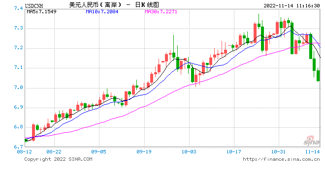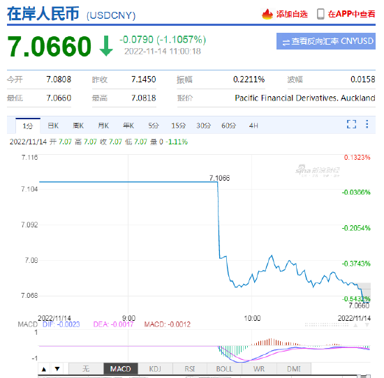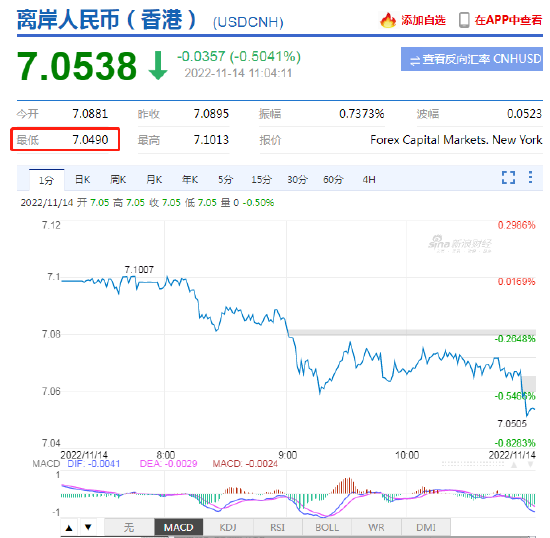 11月14日,人民币持续拉升,在岸日内升值近800点,离岸升破7.05。