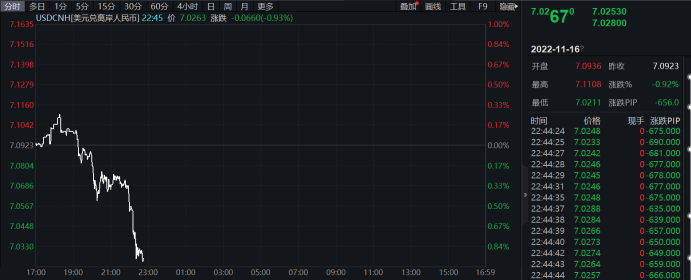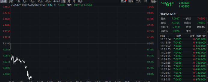 11月14日,银行间外汇市场人民币对美元汇率中间价报7.0899元,创2022年9月27日以来新高,并较前值调升1008个基点,单日调升幅度创2005年7月22日以来最大。