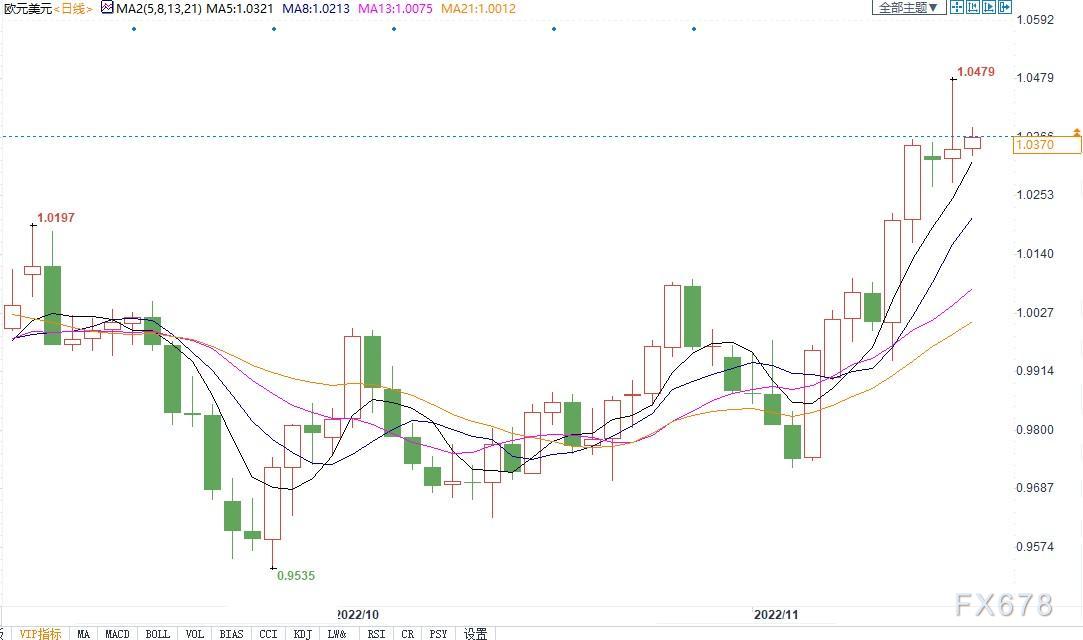 11月16日(周二),因美国若于预期的10月通胀数据引发美元持续下跌,欧元兑美元一度升至7月1日以来的最高水平1.0479,最后收涨0.21%,报1.0347。丹麦央行(DNB)当天表示,不排除汇价进一步上涨至1.10的可能性。