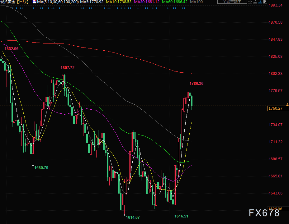 金价周四下跌近1%,美元反弹,美联储官员最近的发言暗示将继续收紧政策以抑制通胀。 现货金下跌0.8%,至每盎司1760.43美元,盘中稍早曾跌至1753.6美元。RJO Futures高级市场策略师Bob Haberkorn表示,美联储官员表示美国通胀需要进一步放缓,“市场将这解读为利率将更高,导致黄金隔夜遭遇抛售。美元因美联储仍将继续加息的这些言论而走强,黄金在利率上升中首当其冲受到打击。”