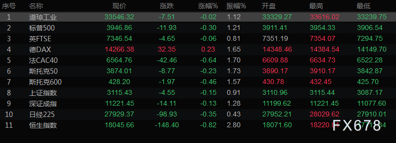 美股收盘情况:道琼斯工业指数下跌0.02%,至33546.32点;标普500指数下跌0.31%,至3946.56点;纳斯达克指数下跌0.35%,至11144.96点。