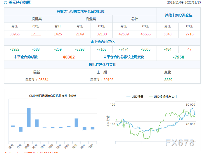 汇通网CFTC持仓数据:截至11月15日当周,美元净空头头寸为1050万美元,此前一周净多头头寸为23.6亿美元,为2021年7月中旬以来首次。11月15日当周,投机者所持原油净多头头寸减少49975手合约,至401767手合约。