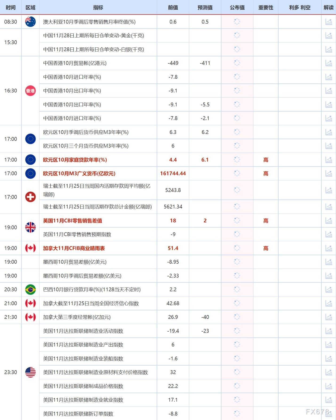 11月28日,投资者需要关注的重点数据:欧元区10月家庭贷款年率,欧元区10月家庭贷款年率,英国11月CBI零售销售差值,加拿大截至11月25日当周全国经济信心指数,加拿大第三季度经常帐和美国11月达拉斯联储制造业活动指数。需要关注的大事件包括欧洲央行管委诺特发表讲话, 欧洲央行行长拉加德发表讲话。