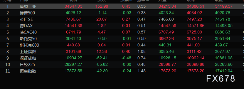 美股收盘情况:道琼斯工业指数上涨0.45%,至34347.03点;标普500指数下跌0.03%,至4026.12点;纳斯达克指数下跌0.52%,至11226.36点。