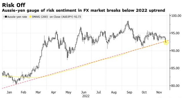 在人们担心美联储的鹰派立场之际,衡量外汇市场风险情绪的一项关键指标正在发出警告信号。澳元兑日元已跌破今年以来的上行趋势支撑位和200日移动均线,这一突破为进一步下行指明了道路,表明汇市情绪恶化。周一,澳元兑日元暴跌1.6%,原因是交易员对美联储官员强调需要进一步加息做出了反应。鉴于风险敏感的澳元与传统避险货币日元之间的不同,外汇交易员密切关注该破位趋势。