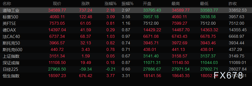 美股收盘情况:标普500指数跳涨3.09%,收报4,079.97点;纳斯达克指数大涨4.41%,报11468.00点;道琼斯工业指数急升2.18%,报34589.24点。