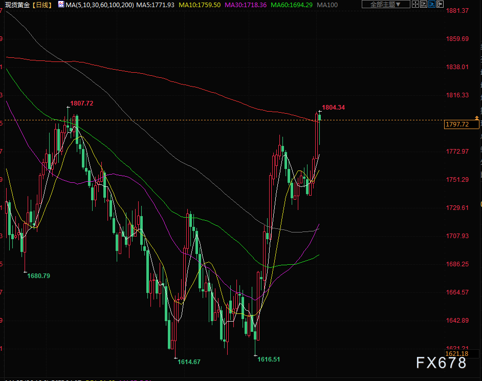 现货金下跌0.4%,至每盎司1794.96美元,稍早触及8月10日以来最高的1804.46美元。