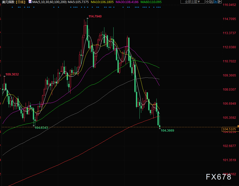 美元指数尾盘下跌0.13%,报104.50;欧元上涨0.10%,至1.0537美元,为6月28日以来最高。