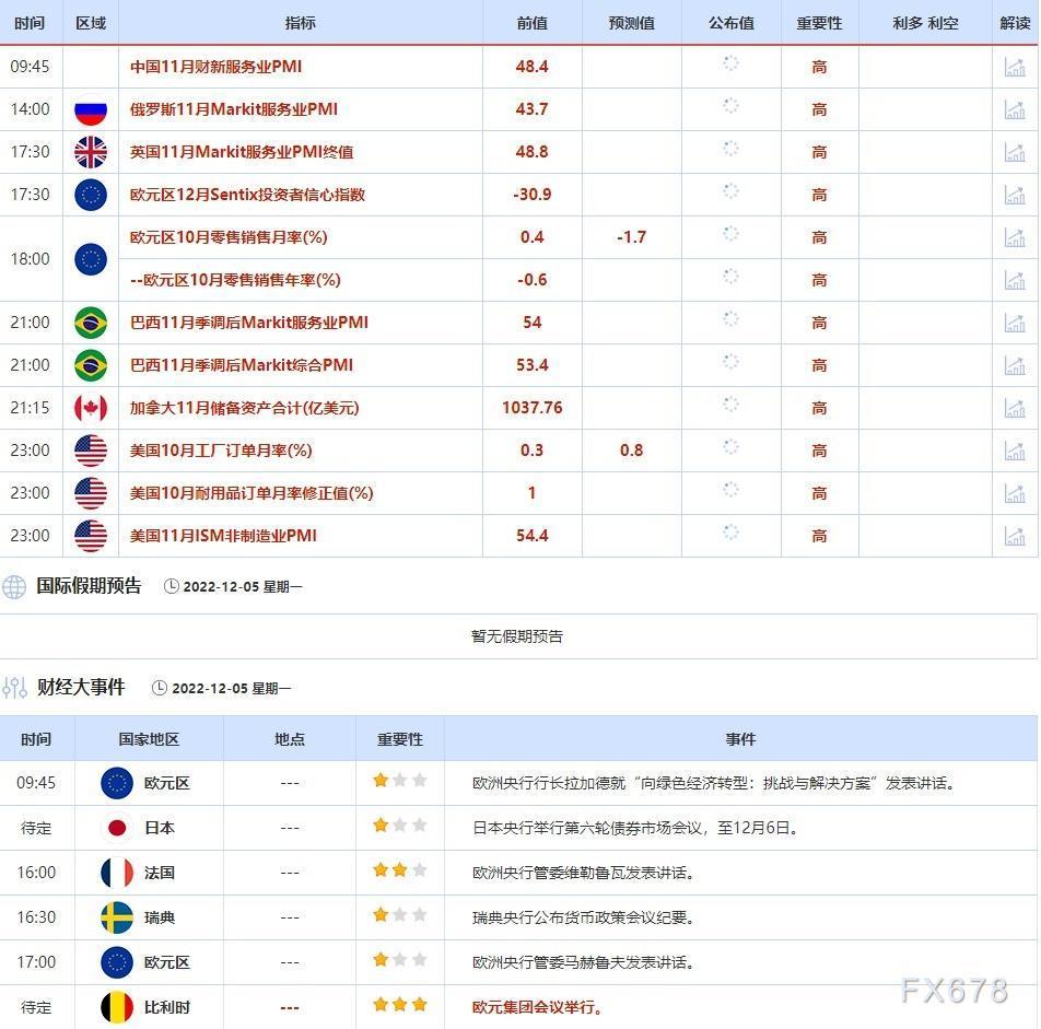 ①12月5日(周一)关键字:欧元区12月Sentix投资者信心指数,欧元区10月零售销售月率,欧元集团会议