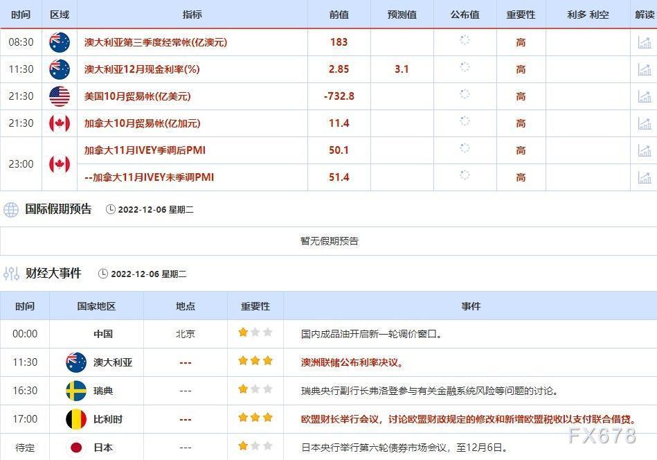 ②12月6日(周二)关键字:澳洲联储公布利率决议,美国10月贸易帐,欧盟财长会议