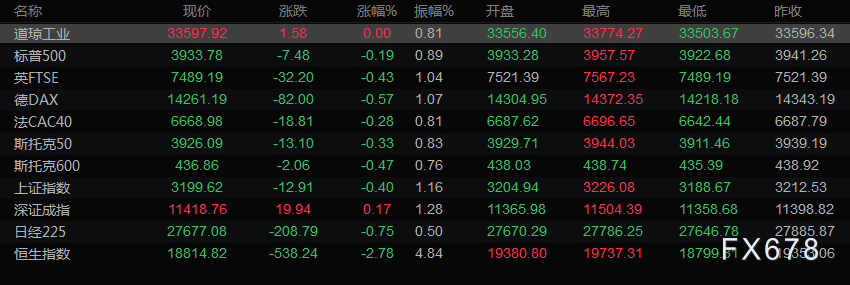 美股收盘情况:道琼斯指数收盘上涨0.53点,报33596.87点;标普500指数收盘下跌0.18%,报3933.99点;纳斯达克综合指数收盘下跌0.51%,报10958.55点。