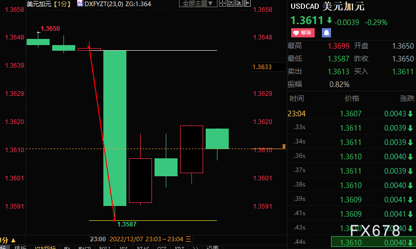北京时间周三(12月7日)23点,加拿大央行如期加息50个基点至4.25%,加拿大央行“考虑”需要进一步加息以遏制通胀,但暗示明年经济停滞。截至发稿,美元兑加元跳水58个点至1.3587后回补半数跌势。