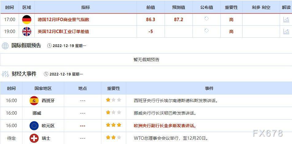 ①12月19日(周一)关键字:德国12月IFO商业景气指数,欧洲央行副行长金多斯