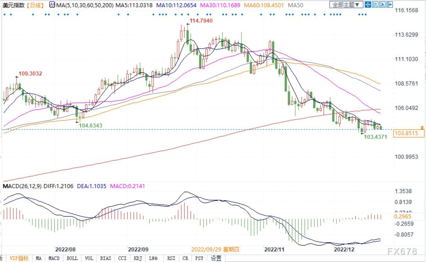 北京时间12月22日13:24,美元指数报103.85
