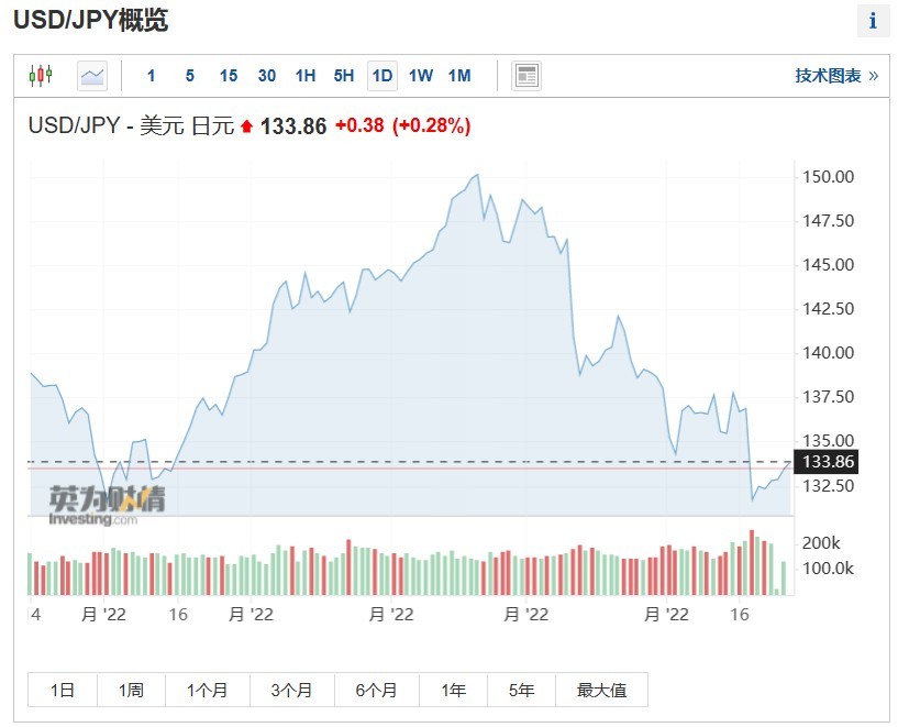 周三,美元兑日元汇率攀升至一周多高点,截至发稿,美元兑日元汇率涨0.28%,报133.86;该汇率日内早些时候触及134.40,为12月20日以来首次。