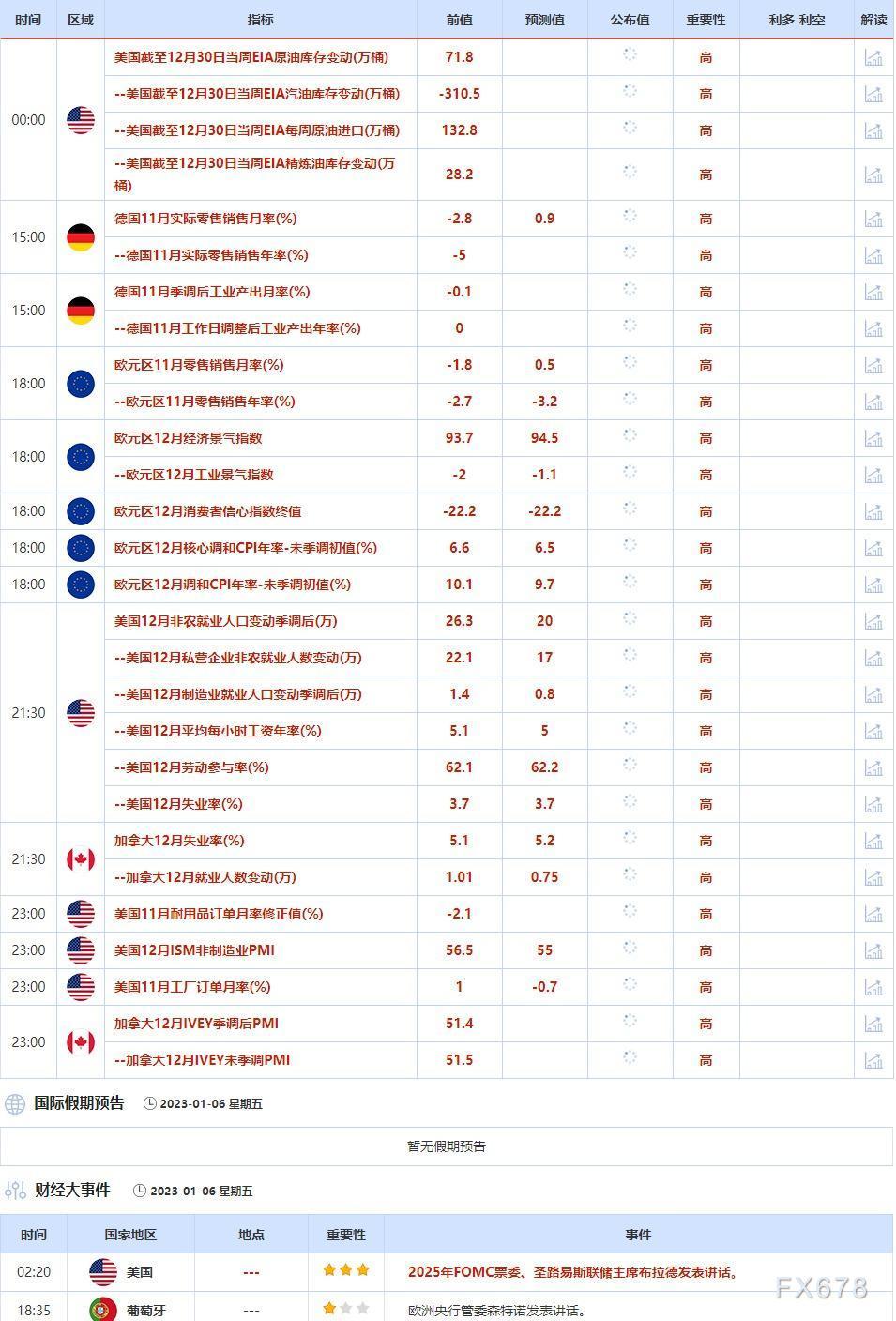 ⑤1月6日(周五)关键字:美国截至12月30日当周EIA原油库存变动,欧元区12月经济景气指数,美国12月非农,圣路易斯联储主席布拉德