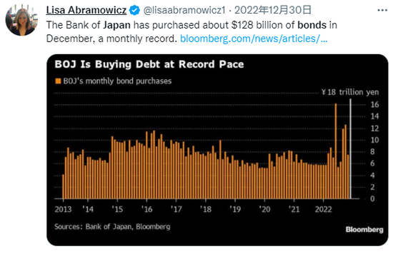 根据统计,为捍卫最新的收益率目标上限,日本央行在12月按固定金额和固定收益率进行的购债总规模已达到了史无前例的逾17万亿日元(约合1280亿美元),超过了今年6月(16.2万亿)的前历史纪录。
