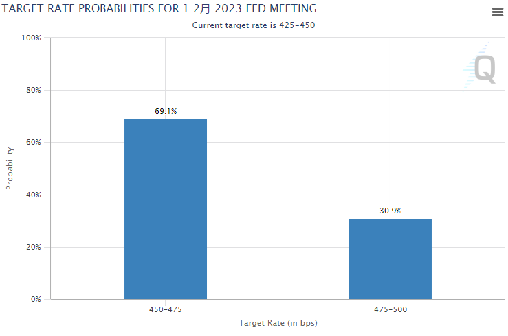 数据公布后,联邦基金利率掉期显示市场对美联储加息幅度预期进一步下滑,现预计利率峰值为5.00%。芝商所的美联储观察工具显示,该行有近七成的概率在2月会议上加息25个基点。