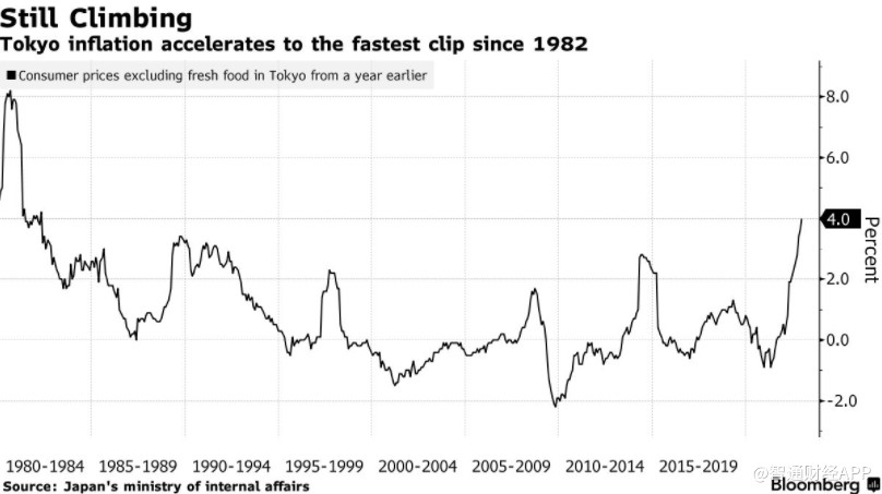 最新数据显示,去年12月东京通胀率自1982年以来首次达到4%,表明潜在的价格趋势强于经济学家的预期。