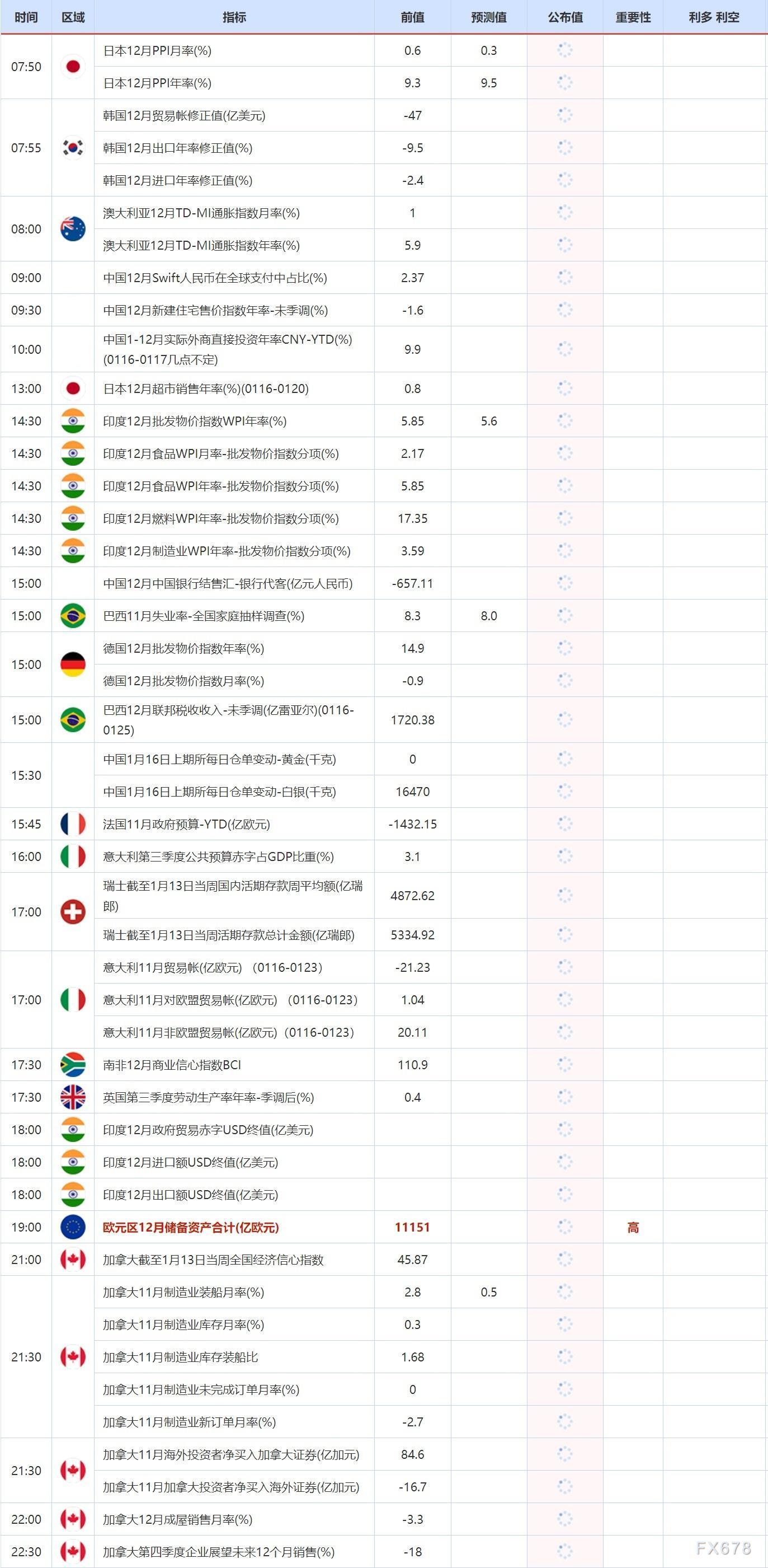 1月16日(周一),投资者需关注的重点数据:日本12月PPI月率,日本12月PPI年率,韩国12月贸易帐修正值,德国12月批发物价指数年率,德国12月批发物价指数月率,欧元区12月储备资产合计。需关注的大事件:欧元集团财长会议举行,2023年达沃斯世界经济论坛年会进入第二天。