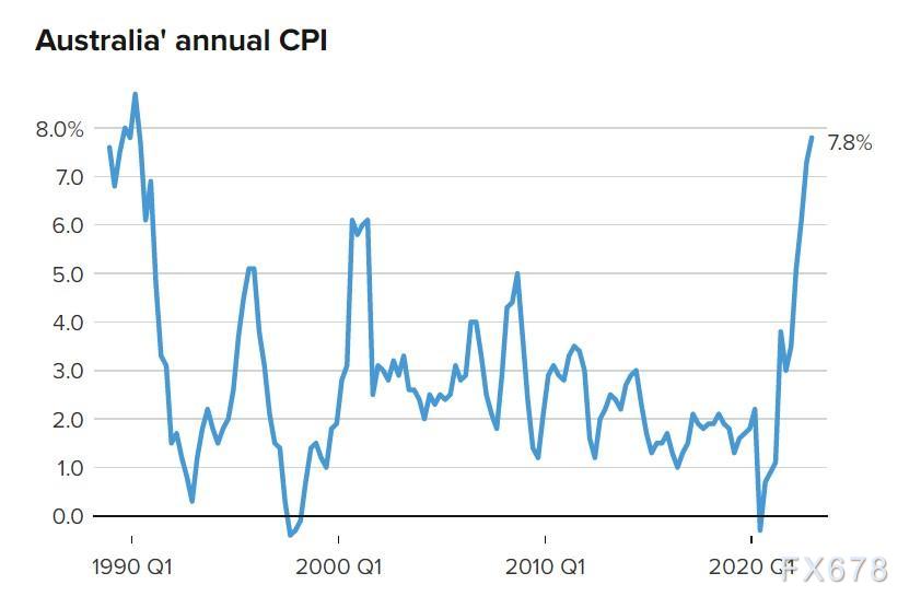 北京时间1月25日公布的数据显示,澳大利亚2022年第四季度CPI年率为7.8%,创下32年来的新高,为1990年3月以来的最高水平。这一结果表明,即使在2022年5月至12月加息3个百分点之后,澳大利亚的通胀仍然非常强劲。