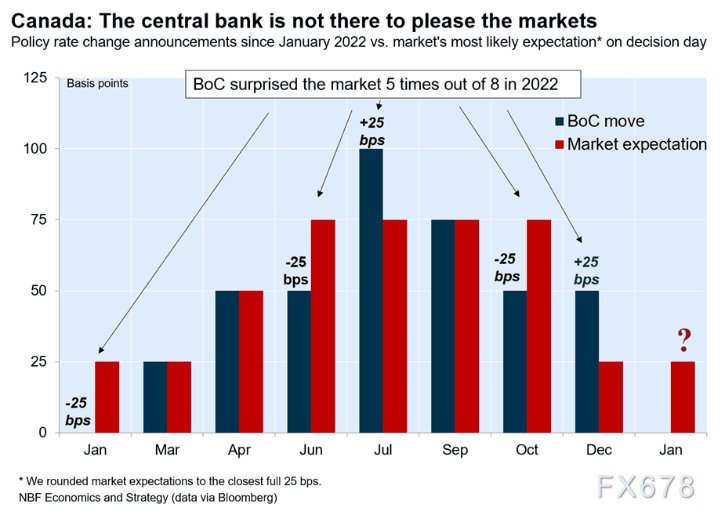 巴克莱分析师预计,加拿大将在1月25日加息25个基点,大于市场预期的20个基点,这将对加元有利。但美国银行表示,加拿大央行周三的加息将是本轮加息周期中的最后一次,这可能会削弱加元。荷兰国际的经济学家也预计,周三欧洲央行将最后一次加息25个基点,同时还预计2023年晚些时候可能会降息。