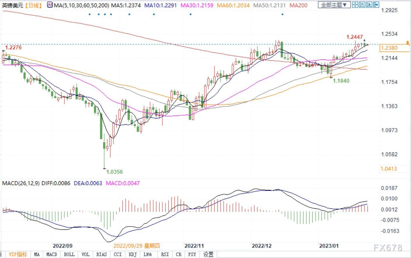 1月23日,市场分析师James Skinner称,周一英镑兑美元一度升至近六个月高位,若能突破技术阻力位1.2504,未来数日可能进一步上扬。如果英国和美国经济数据仍有利于高风险货币持续反弹,汇价则有可能逼近1.26。
