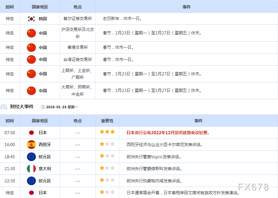 1月23日(周一),本周需关注日本央行将货币政策会议纪要,日本首相岸田文雄将就施政方针发表演说;欧洲央行行长拉加德将发表讲话,从中寻求欧洲央行政策路径信息,加拿大央行发布利率决议,春节假期交投相对清淡,但还需注意市场不确定性风险。