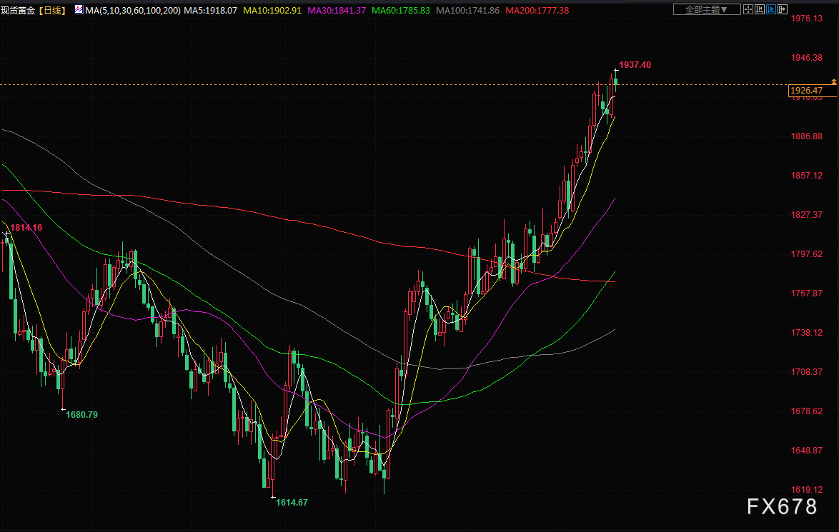 金价上周五下跌,美元走强,不过,金价周线仍连续第五周上涨,受助于美联储放缓步伐加息的希望。现货金下跌0.2%,至每盎司1928.06美元,盘中稍早一度触及4月22日以来最高的1937.49美元。本周迄今,现货金已涨0.4%。