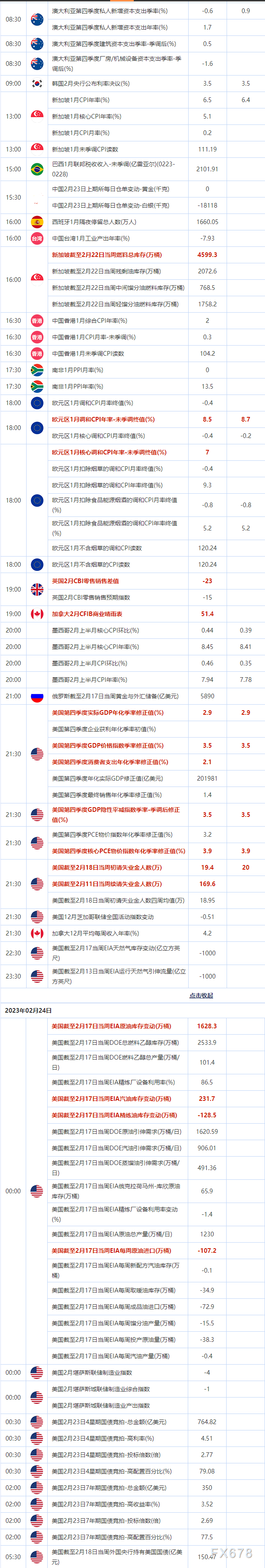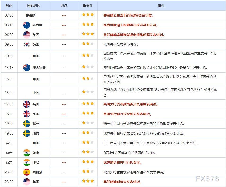 2月23日需要重点关注以下数据:欧元区1月核心调和CPI年率、英国2月CBI零售销售差值、加拿大2月CFIB商业晴雨表、美国截至2月18日当周初请失业金人数、美国第四季度实际GDP年化季率修正值、美国第四季度核心PCE物价指数年化季率修正值;需要关注以下事件:英国央行货币政策委员曼恩发表演讲、英国央行副行长坎利夫发表讲话、美联储博斯蒂克发表讲话、G20财长和央行行长会议。
