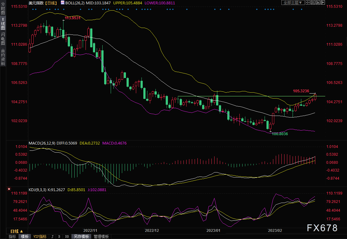 周一(2月27日)亚市盘初,美元指数窄幅震荡,目前交投于105.22附近。美国1月PCE数据强于市场预期,强化了人们对利率可能在更长时间内维持高位的预期,美元指数上周五继续冲高,创近七周新高至105.32,周线上涨1.33%,录得9月底以来的最大涨幅;金价则延续跌势,日线录得四连跌,现货黄金盘中创下近八周新低至1808.84美元/盎司。