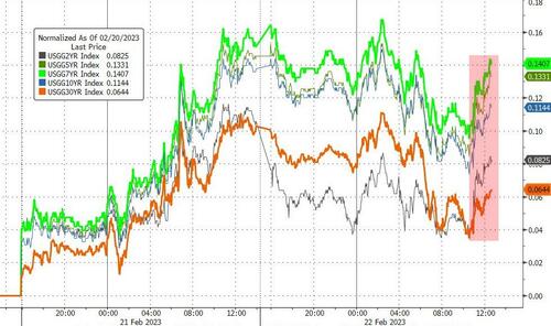 美国股债市场在周三纽约时段尾盘纷纷动荡加剧,当天公布的美联储2月会议纪要强化了人们对美联储将在更长时间内维持高利率的预期,最终标普500指数连续第四个交易日走软,创下了今年以来最长的连跌走势,而美债收益率则整体维持在近期的高位附近。
