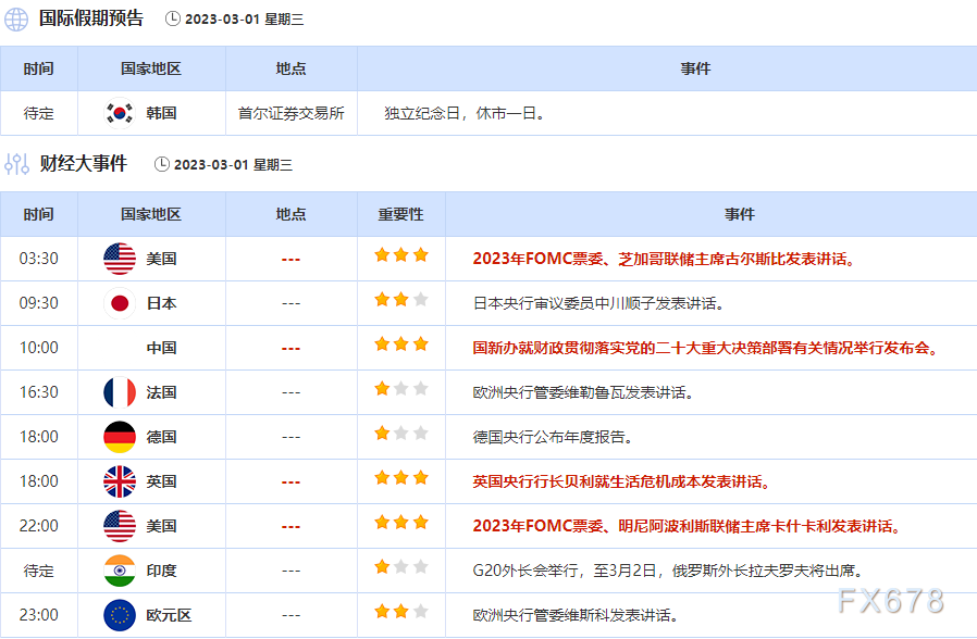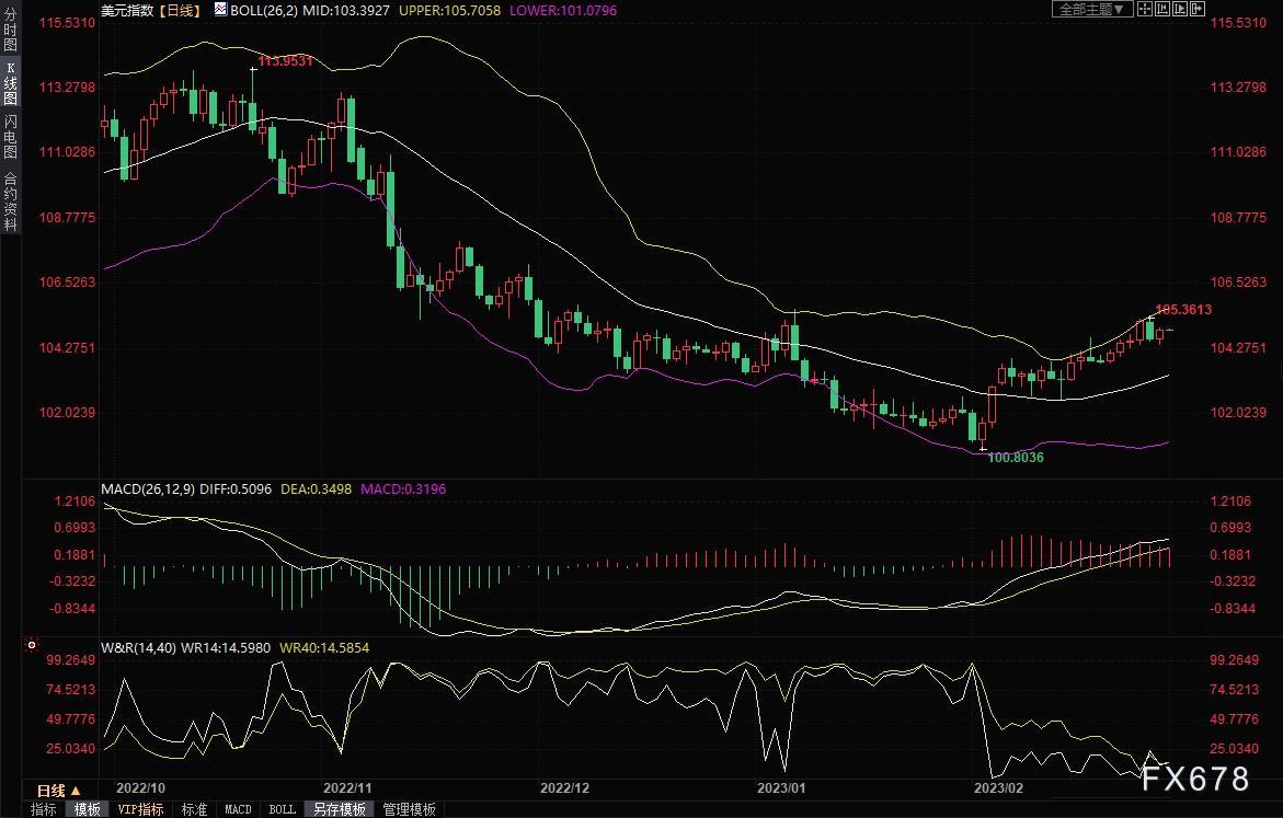 周三(3月1日)亚市盘初,美元指数窄幅震荡,目前交投于104.94附近。美元兑主要货币周二在震荡交投中攀升,录得9月以来的首次月线上涨,通胀仍居高不下之际,人们预计利率将在一段时间内保持高位,且对经济衰退的担忧使投资者感到紧张。受到中长线逢低买盘支撑,金价周二上涨0.54%。油价周二上涨近2%,收复了上一交易日的失地,并一度创下逾一周新高,因为对中国经济强劲反弹的希望抵消了对美国加息拖累世界最大经济体原油消费的担忧。