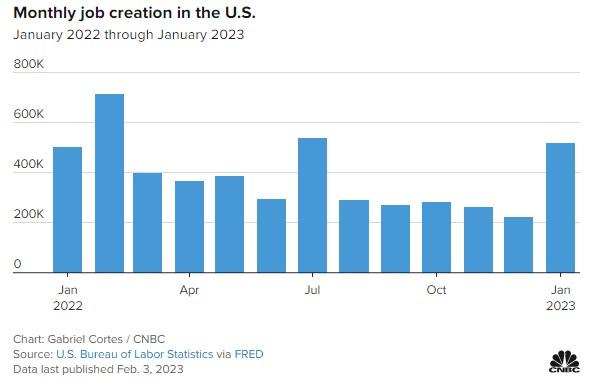 图2:美国月度创造的工作岗位数量(2022年1月始至2023年1月末)