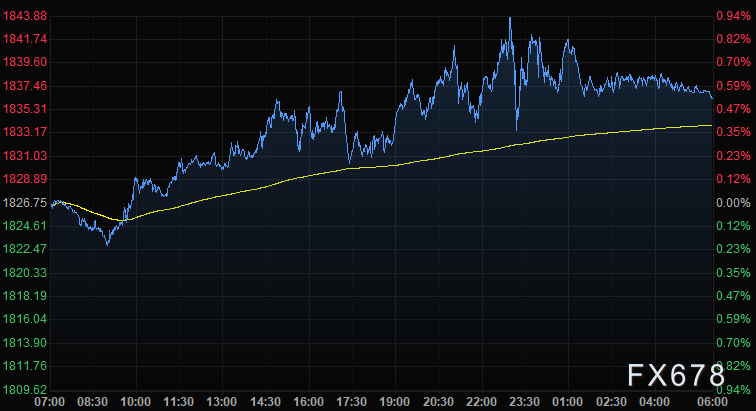 现货黄金上涨0.5%,报每盎司1836.50美元,盘中稍早触及1844.5美元的一周来最高。美国期金结算价报每盎司1845.40美元,上涨0.5%。