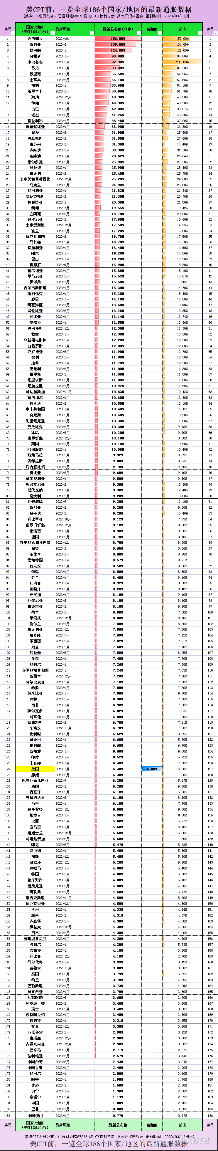 美国硅谷银行破产风暴、市场流动性危机的担忧升温之际,周二(3月14日)将出炉的美国2月通胀报告,愈发备受关注。而且下周就迎来美联储决议,市场热议这三者对金融市场的影响。本文一方面整理了全球186个国家地区的最新通胀数据排行榜(见下图1),同时也汇总了一些著名投行机构及经济学家的对此三者的看法观点。