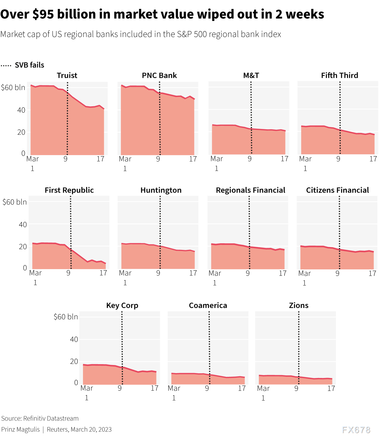 如下图所示,随着硅谷银行倒闭,标普500指数中的主要银行股出现大跌。短短两周,美国银行整体市值就蒸发逾950亿美元。