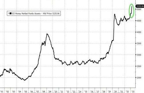 根据美国投资公司协会的数据,在截至3月22日当周,约有1174亿美元流入了美国货币市场基金,这使其总资产达到了5.132万亿美元,创下历史新高。道明证券策略师Gennadiy Goldberg表示,这一流入情况与银行系统持续的存款外逃相一致,表明储户通过货币基金间接将现金投资于政府债券,避开了银行信贷。