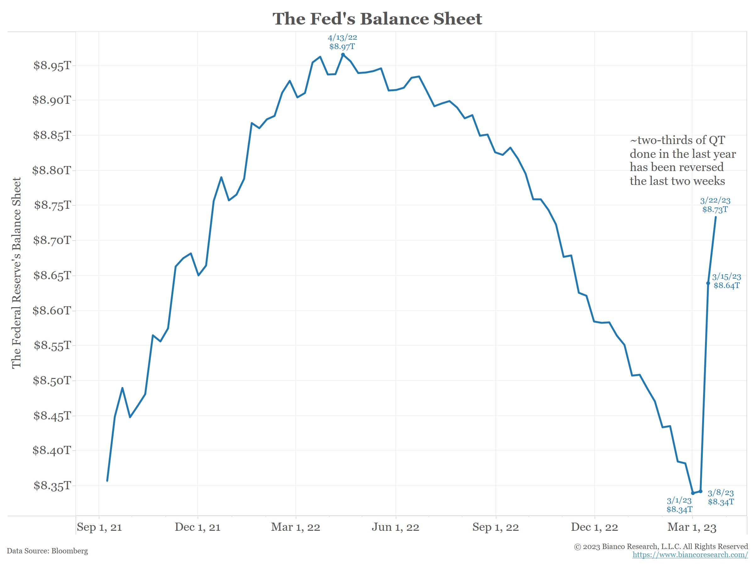 在过去两周,美联储资产负债表规模已累计激增了3930亿美元,这几乎相当于过去大半年美联储缩表规模的近2/3。美联储资产负债表规模曾在去年4月触及8.965万亿美元的峰值,在本轮银行业危机爆发前的本月初,则曾一度回落至8.34万亿美元。