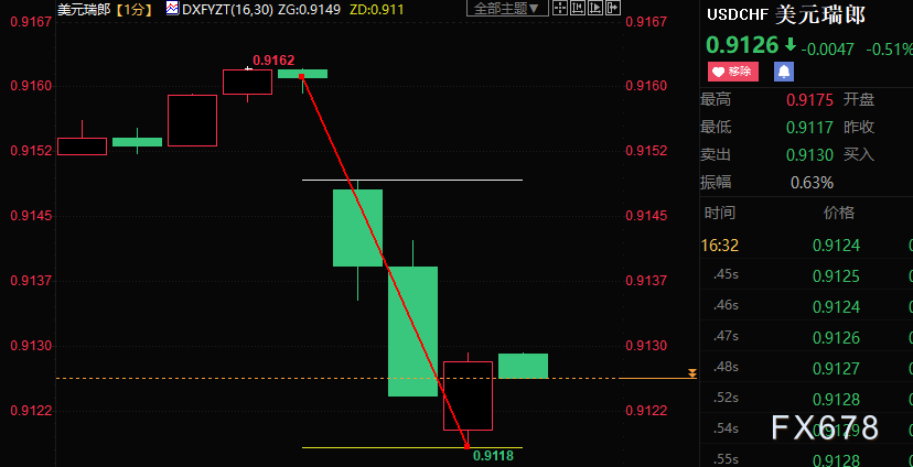 北京时间周四(3月23日)16:30,瑞士央行公布新政,如期加息50个基点至1.50%,并且不排除进一步加息可能。截至发稿,美元兑瑞郎下跌43个点至0.9118。