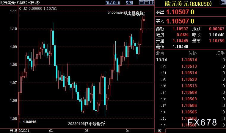 欧元兑美元四连涨,涨幅逾1.4%,创2022年4月初以来新高至1.1075。几位欧洲央行决策者认为,欧洲央行有理由进一步加息,但对需要加多少提出了不同观点。而消息人士称,尽管其他选项仍在讨论之列,决策者趋于就5月加息25个基点达成一致。