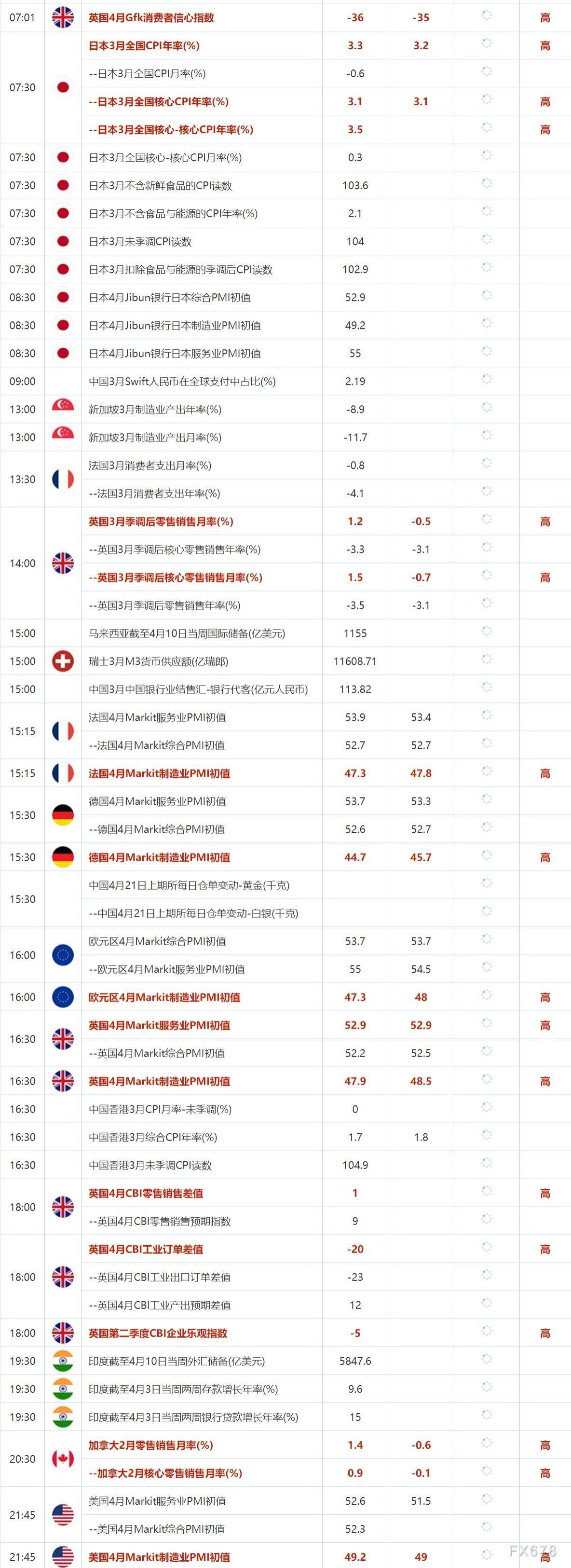4月21日,投资者需要关注的重点数据:日本3月全国CPI年率,英国3月季调后零售销售月率,德国、英国、欧元区、英国和美国4月Markit制造业PMI初值,英国4月CBI工业订单差值,加拿大2月零售销售月率。需要关注的大事件包括费城联储主席哈克就经济前景发表讲话, 欧洲央行副行长金多斯发表讲话。